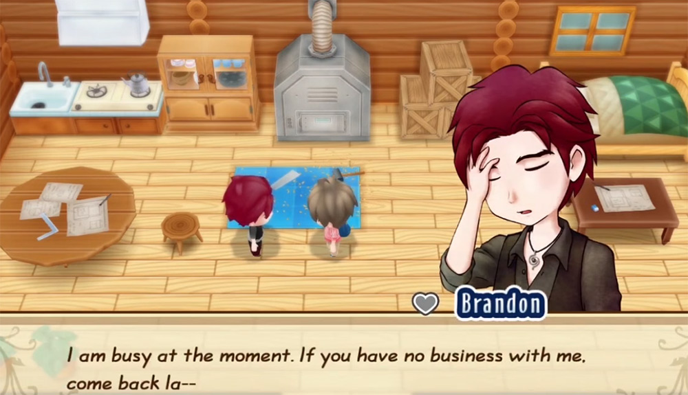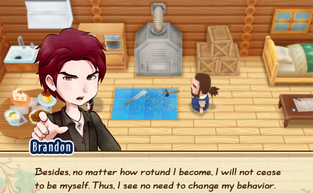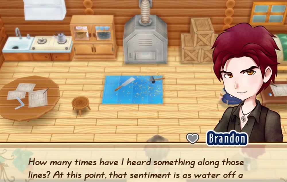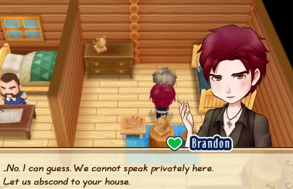 While visiting your farm to learn more about your work, Brandon notices your house is in a state of disrepair and decides to fix it for you, finding new artistic inspiration in the process. He then tells you he must leave to give form to his new ideas. |