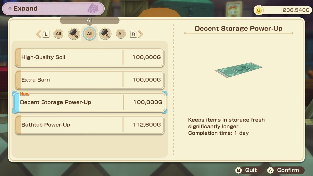 You can then purchase storage upgrades from him that keep the items in your storage fresher for longer. The final late-game storage upgrade that costs 5,000,000 G makes it so that your items never spoil in storage.