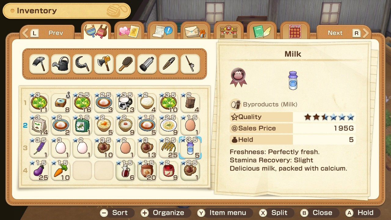 Over time, an item’s freshness value decreases. This process reduces the item’s selling price, gifting value, and the amount of stamina you recover when eating it as food. However, not all items have a freshness value. Non-perishable items such as ores, tools, or clothing are unaffected.